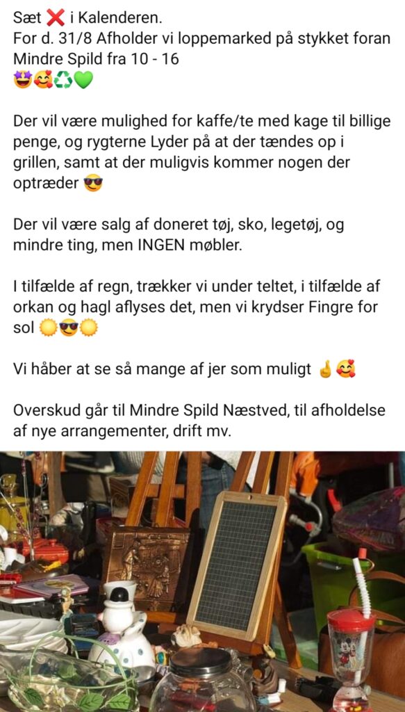 Arrangementer afholdes i Medborgerhuset Næstved, Sct. Peders Kirkeplads 14 d. 29. sept. fra kl. 17:00 – 21:00. Vi har plads til 50 spisende gæster, hvorfor tilmelding er nødvendig ved at sende os en PB med “MINDRE SPILD JA TAK” og antal deltagere (max 4 pr. tilmelding). Tilmelding er først gyldig, når der er modtaget kvittering fra os. 😉
